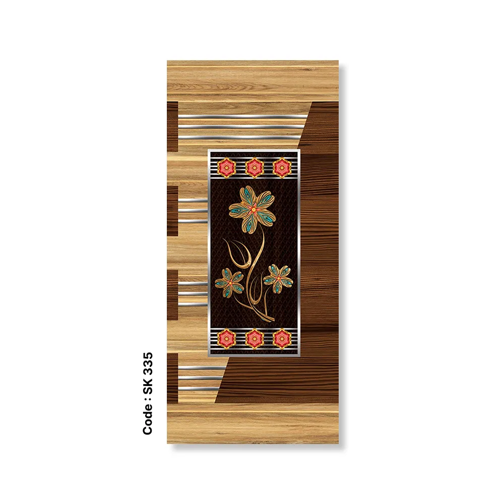 Layers multiple wood textures to achieve a rich, crafted appearance. The base uses horizontal bands of light oak with slim metallic strips, contrasted on one side by a diagonal block of darker wood that adds depth and structure. At the centre, a tall dark panel hosts stylized floral motifs in teal and gold, framed on the top and bottom with repeating hexagonal ornaments and fine striped borders. This laminated German door is ideal for entrances, living rooms, and pooja areas where a touch of classic decorative style is desired without losing contemporary appeal.