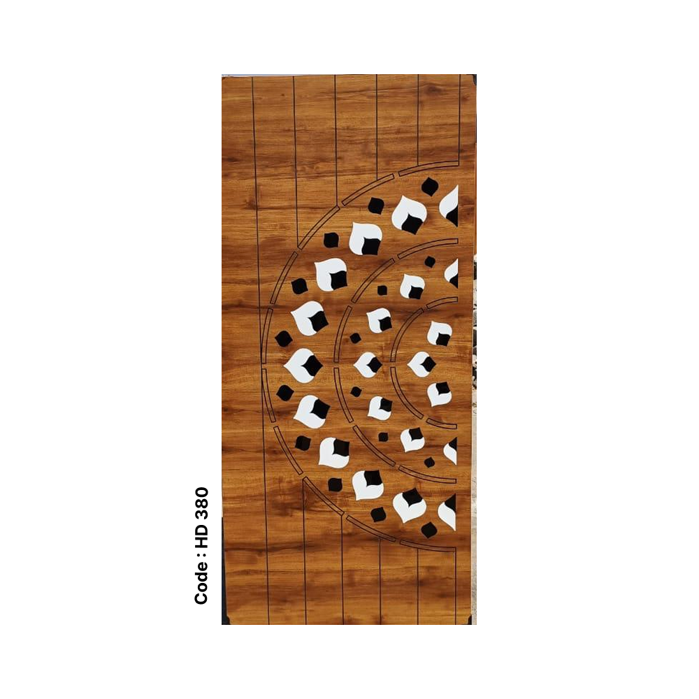 Showcases a rich teak woodgrain surface divided by fine vertical groove lines, giving a sleek panelled look. The highlight is a large off-centre circular design built with concentric arcs and scattered white-and-black 3D blocks, creating a mandala-inspired focal point that feels both artistic and contemporary. Ideal for premium flats, villas, studios, and creative office spaces, this designer door adds strong visual interest while maintaining a smooth, easy-to-clean finish.