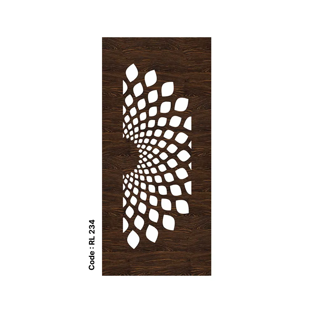 Showcases a rich dark‑wood base with an eye‑catching vortex of almond‑shaped petal cutouts running vertically, creating a 3D illusion and adding depth to any room. The dynamic pattern makes this an excellent choice for feature doors in living rooms, bedrooms, and passage areas where a modern statement is needed. Manufactured on durable WPC substrate, the door is waterproof, termite proof, and easy to maintain, offering both designer appeal and long‑lasting performance.
